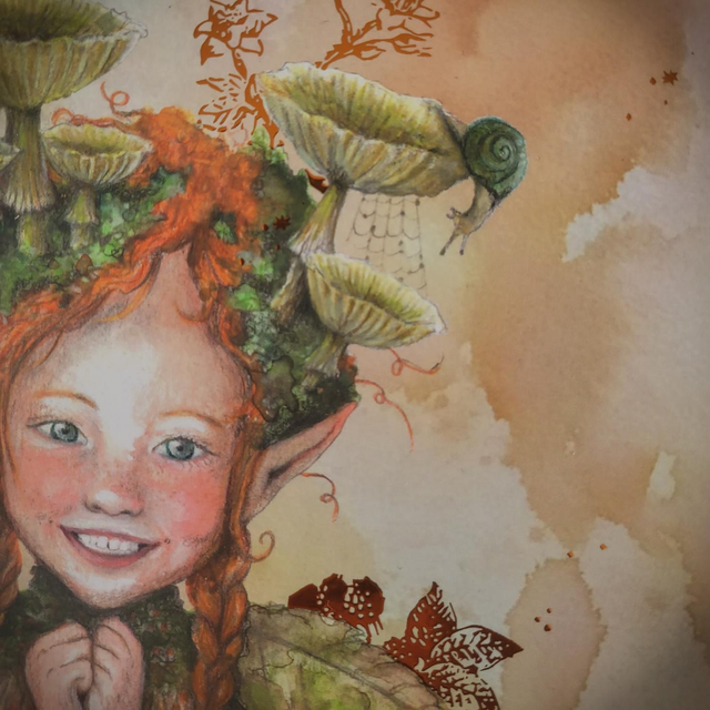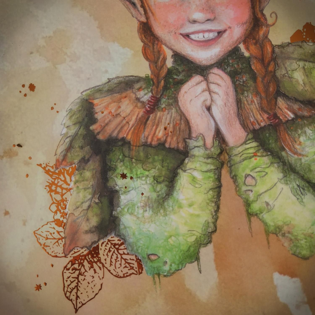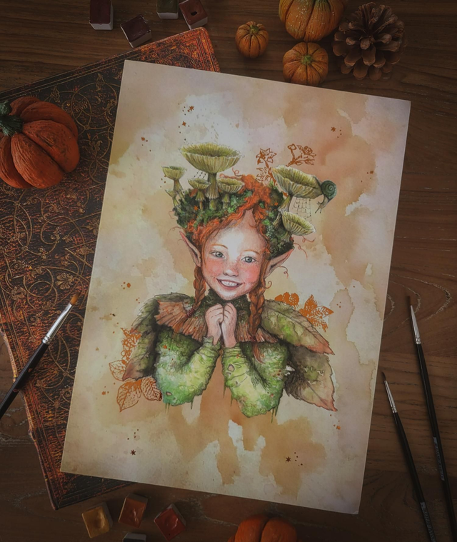 Réalisée à la main avec des crayons de couleur et de l'aquarelle, elle capture la magie de l'automne avec ses finitions bronze étincelantes.🎨🍂🍁✨️