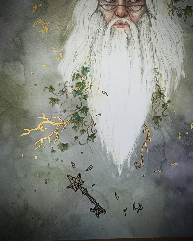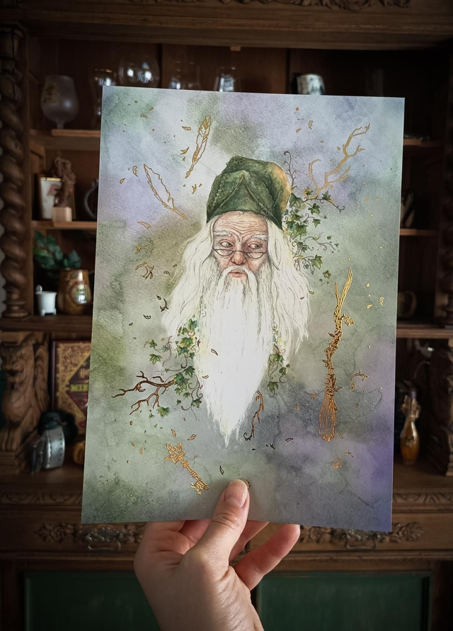 Réalisée à la main avec des crayons de couleur et de l'aquarelle, elle capture la magie sombre de l'automne avec ses finitions dorées étincelantes.🎨🍂🍁✨️