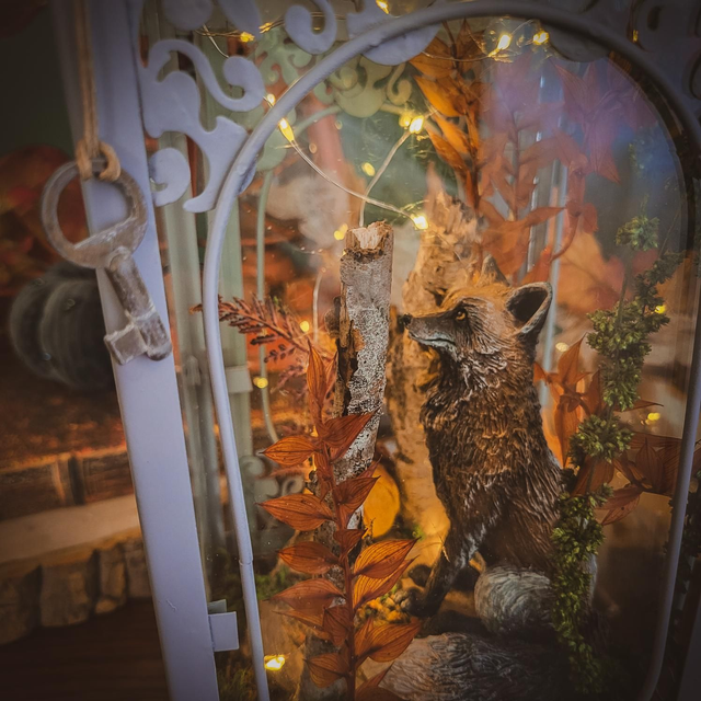 Il veille dans un paysage automnal de mousse et de citrouille, comme sorti d’une légende oubliée. À la poignée de la lanterne pend une vieille clé chinée, gardienne de mystères. 🦊🖤🍁🎃🍂