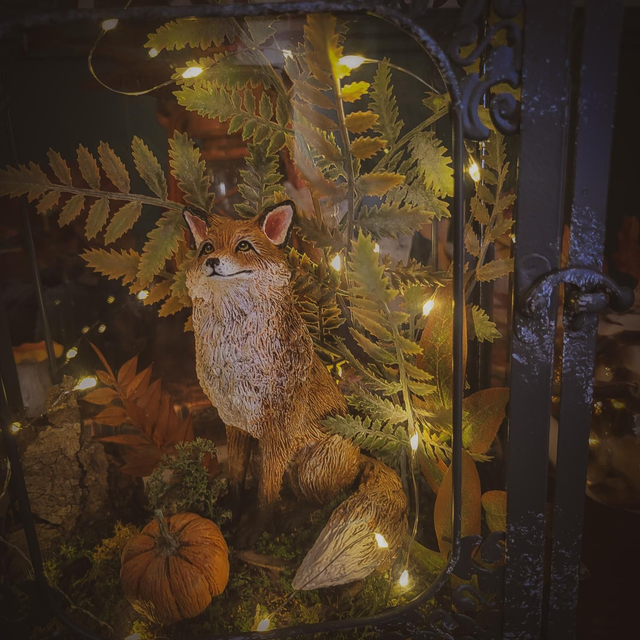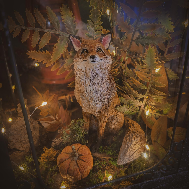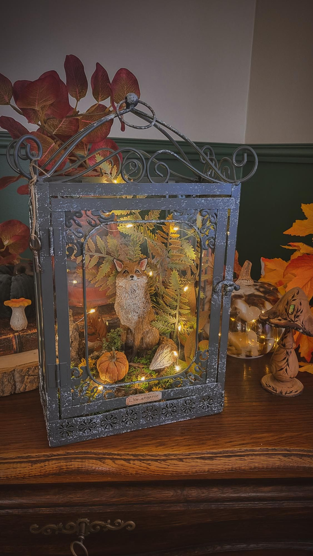 Dans une lanterne ancienne, un renard roux s’est installé comme gardien des veillées d’octobre.