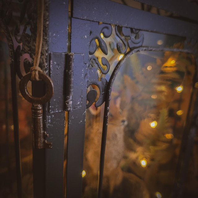 Sculpté et peint à la main, il repose dans un décor miniature fait de mousse, de citrouille et de nuances orangées. À la lanterne pend une vieille clé, gardienne des secrets de l’automne.