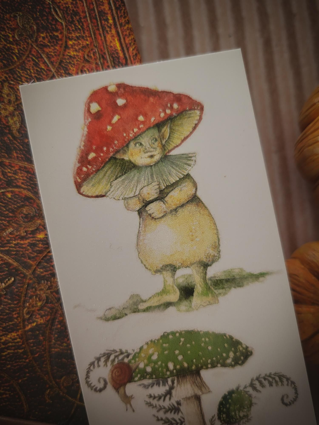 Un petit Troll champignon se balade au milieu d'amanite verte et de souche habitée par une grenouille et un escargot voyageur.