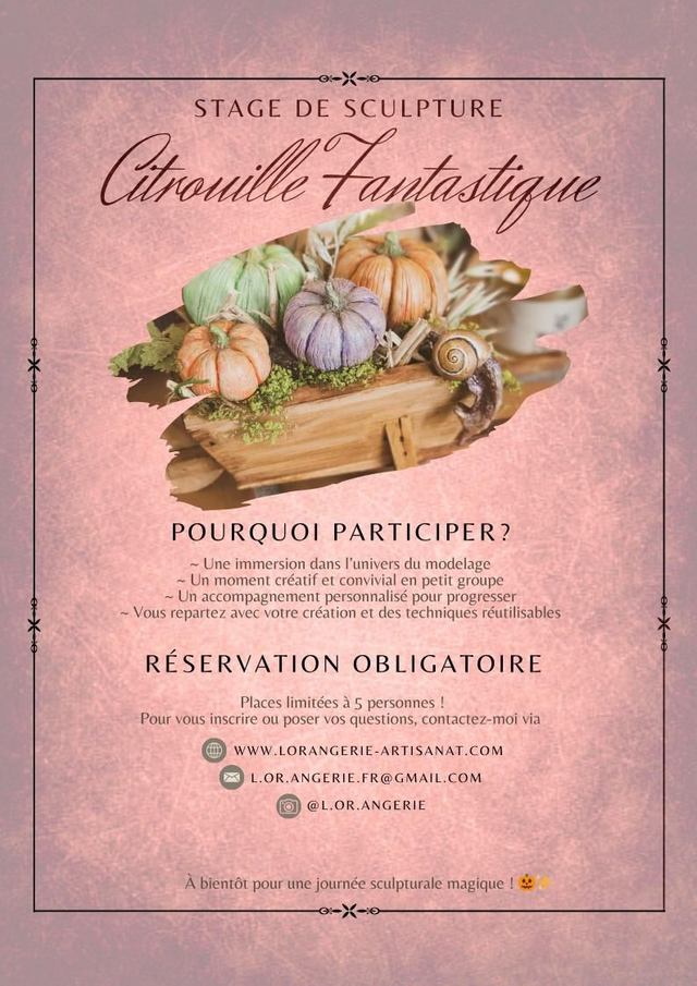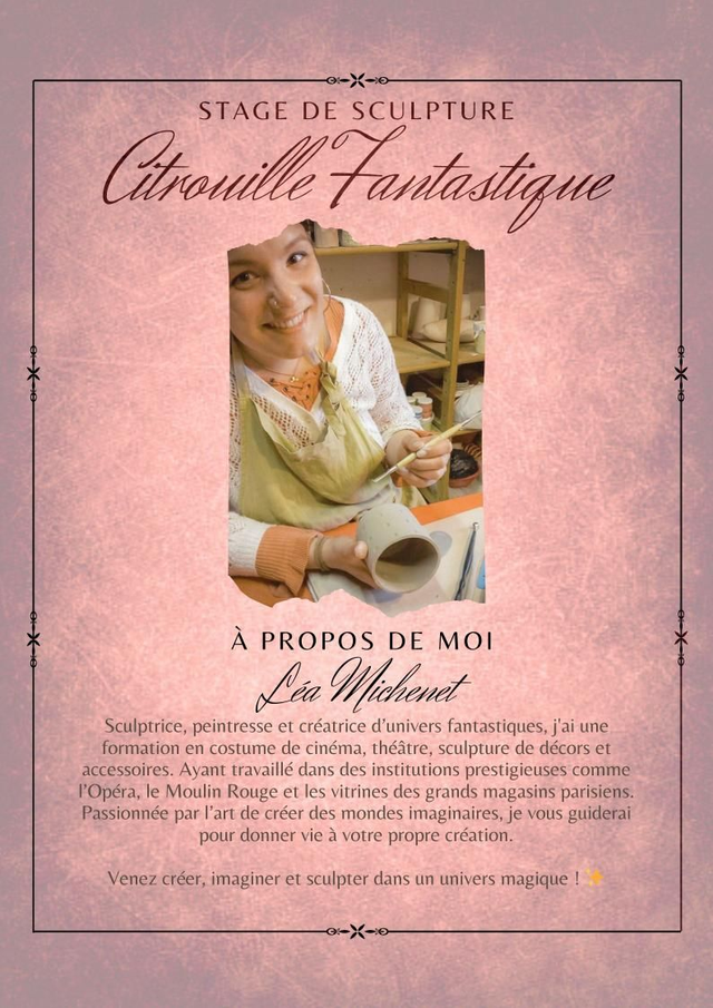 Venez apprendre à sculpter une citrouille réaliste en modelage ! Que vous soyez novice ou que vous ayez déjà touché à la sculpture, ce stage vous guidera pas à pas pour créer votre propre petite œuvre en volume.